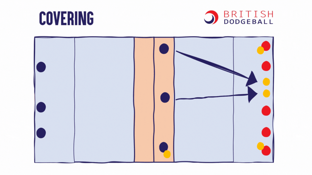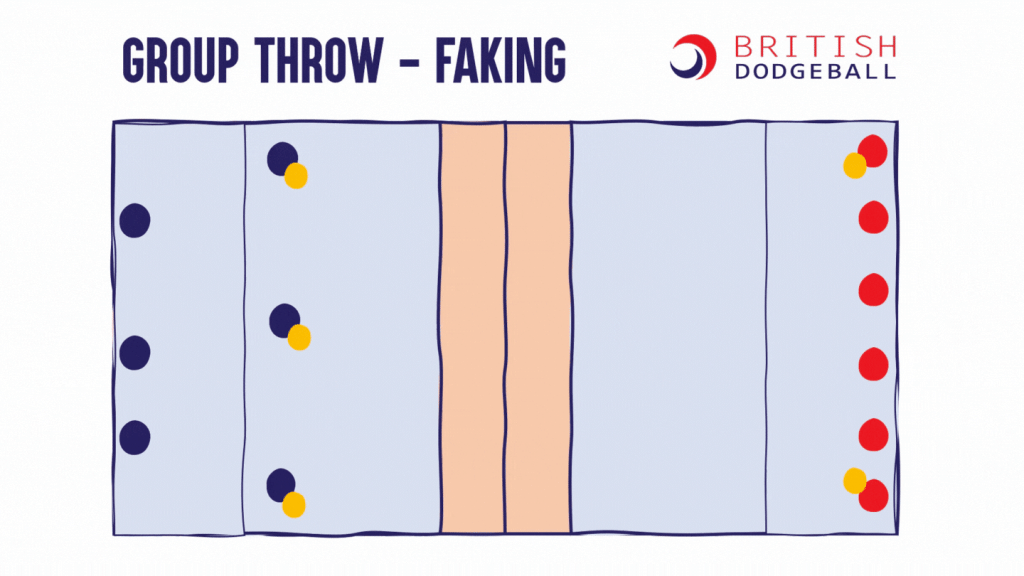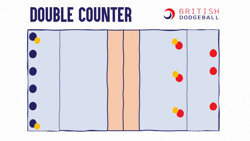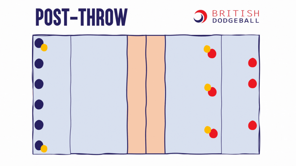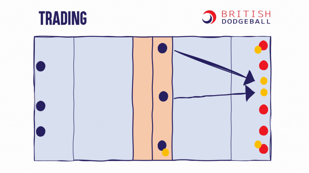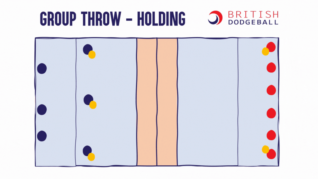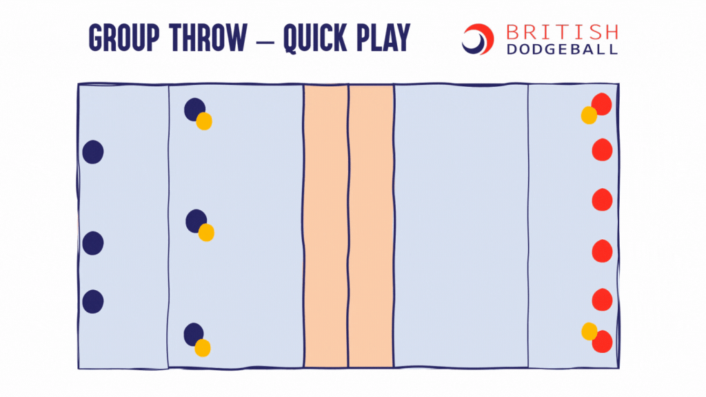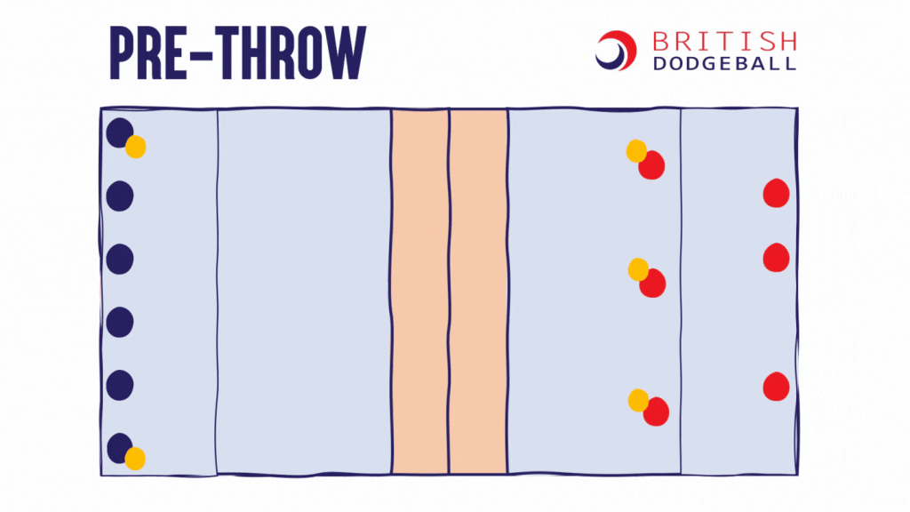 This page contains visualisations of a range of tactics which are useful at a range of dodgeball levels. You may remember a couple of these from the Level 1 Award in Coaching Dodgeball. These tactics are all visualised in the 5-ball game, but all except the last 2 tactics could be applied into the 3-ball u11 game as well.